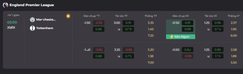 Tottenham Hotspur được đánh giá là đội cửa dưới trước Manchester City và được Manchester City chấp với tỷ lệ kèo cả trận là 1.5 trái. Tỷ lệ chấp cả trận này khá cao cho một trận đấu hay, hấp dẫn và kịch tính như trận đầu này. Manchester City vẫn sẽ dành chiến thắng những sẽ gặp không ít khó khăn trước Tottenham Hotspur.